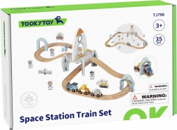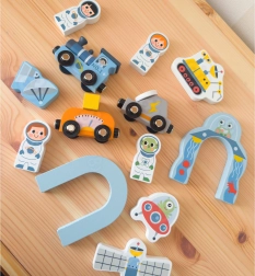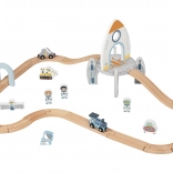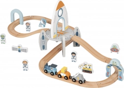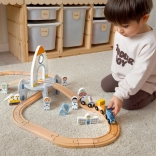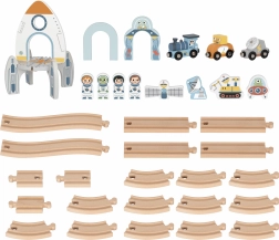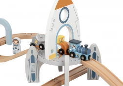 Ta drewniana kosmiczna kolejka wciąga dzieci w świat kosmosu dzięki tematycznym elementom, takim jak figurki astronautów, sonda kosmiczna, łazik i latający talerz. Wielopoziomowe ułożenie torów nadaje zabawie dynamiki. Centralnym elementem zestawu jest duża kosmiczna rakieta, która pełni funkcję dekoracyjną i konstrukcyjną.