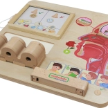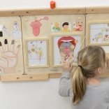 Interaktywna edukacyjna tablica MASTERKIDZ w duchu metody Montessori obrazowo pokazuje, jak działa zmysł węchu. Po dotknięciu kwiatu zapalają się diody LED, które symulują przepływ zapachu z kwiatu do nosa, a następnie przekazanie sygnału do mózgu.