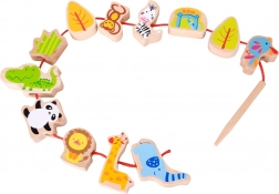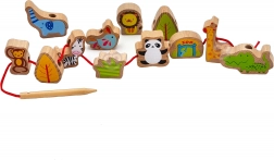 W zestawie znajduje się 12 drewnianych koralików oraz sznurek z drewnianą igłą. Gładkie krawędzie i odpowiedni rozmiar zapewniają wygodne i bezpieczne użytkowanie.