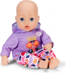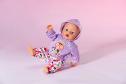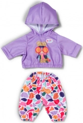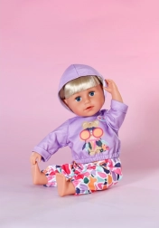 Stylowy zestaw dla lalek w rozmiarze 43 cm: fioletowa bluza z kapturem i wesołym nadrukiem świetnie współgra z kolorowymi spodniami, pozwalając na zabawne łączenie. W zestawie znajduje się także wieszak z materiału z recyklingu. Ubranko wspiera kreatywną zabawę, jest łatwe do zakładania i doskonale pasuje również na BABY born Teddy.