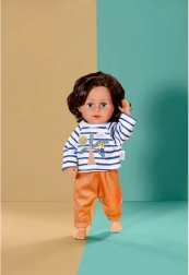Podaruj swojej lalce lub misiowi nowy, świeży strój, który przywołuje lato i beztroski nastrój. Prążkowaną bluzkę z nadrukiem palmy i słońca uzupełniają pomarańczowe spodnie z wygodnym pasem. Zestaw wykonano z przyjemnych w dotyku tkanin, aby ubieranie i zabawa były maksymalnie komfortowe.