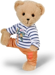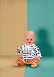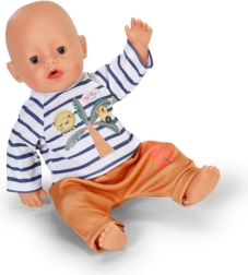 Stylowy zestaw dla lalek BABY born i misia BABY born Teddy wyróżnia się wygodą i zabawnym wzornictwem. Zawiera prążkowaną bluzkę z długim rękawem z motywem palmy i słońca oraz pomarańczowe spodnie z nadrukiem. Strój jest odpowiedni dla lalek o wielkości 43 cm i dzięki miękkim materiałom łatwo się go zakłada. W zestawie znajduje się wieszak z materiału z recyklingu. Idealny do kreatywnej zabawy, łatwego przebierania i długotrwałej frajdy.