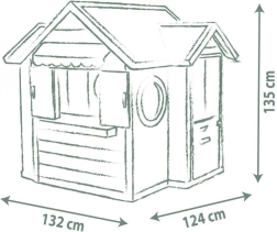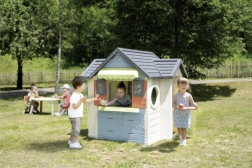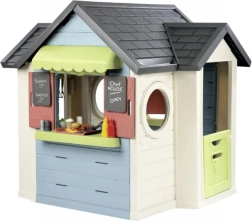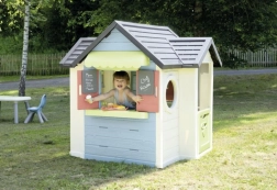 Dziecięcy domek szefa kuchni łączy radość z domku ogrodowego z realistyczną kuchnią dla małych kucharzy. Przez okienko z ladą wydawczą dzieci mogą przyjmować zamówienia, pisać menu na tablicy i podawać „gotowe dania”. Otwierane okiennice i drzwi, teksturowane ściany oraz stylowy dach nadają domkowi autentyczny wygląd.