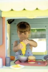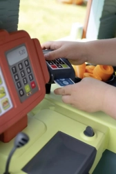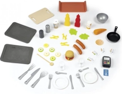 Bogato wyposażona kuchnia obejmuje lodówkę, piekarnik, kuchenkę, zlew z kranem oraz kasę z terminalem płatniczym. W zestawie znajdziesz wiele dodatków: talerzyki, sztućce, napoje, słodkie i słone przysmaki, przybory kuchenne, patelnię do naleśników, sól i pieprz, ketchup oraz musztardę – wszystko do perfekcyjnej zabawy w restaurację.