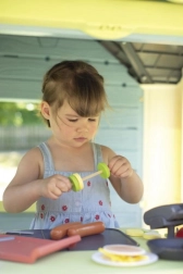 Wbudowana kuchnia z lodówką, piekarnikiem, kuchenką, zlewem oraz kasą z czytnikiem kart zamienia każdy dzień w zabawę w restaurację z prawdziwymi rolami.