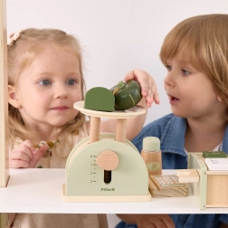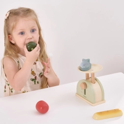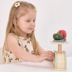 Wspiera wyobraźnię i umiejętności społeczne. Dzieci mogą „ważyć” owoce i warzywa oraz tworzyć własne opowieści i scenki.