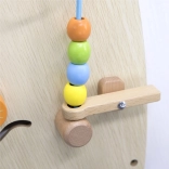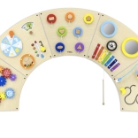 Ta starannie wykonana ścienna tablica w formie półkola wprowadza dzieci w barwny świat odkrywania: koła zębate, labirynty, tor koralików, dopasowywanie kształtów, elementy muzyczne (cymbałki, gong), lustra, „pogoda” i „pory roku”, dysk do kręcenia czy termometr. Dzięki solidnemu montażowi na ścianie oszczędza miejsce i wspiera koordynację oko–ręka, rozpoznawanie kolorów i kształtów oraz logiczne myślenie.