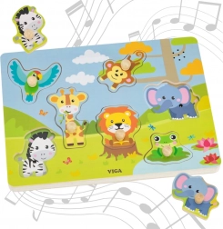 Odkryj świat dżungli z dźwiękowymi drewnianymi puzzlami Viga. Po prawidłowym włożeniu elementu dziecko usłyszy realistyczny odgłos zwierzęcia, co wspiera naukę poprzez zabawę. Zabawka rozwija małą motorykę, koordynację ręka-oko i percepcję dźwięków. Dzięki pomocniczym ilustracjom dzieci łatwiej uczą się prawidłowo dopasowywać kształty.