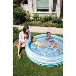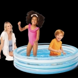 Niebieski nadmuchiwany dziecięcy basen zapewni dzieciom przyjemne orzeźwienie w upalne dni. Stabilna konstrukcja z trzech nadmuchiwanych pierścieni gwarantuje solidność i miękkie krawędzie, a podłoga z miękkiego PVC jest przyjemna w dotyku i ogranicza poślizg.