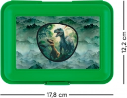 Plastikowe pudełko na przekąski z obrazkiem dinozaura jest nie tylko funkcjonalne, ale też stylowe. Dzięki tradycyjnemu zamkowi zatrzaskowemu utrzymuje jedzenie bezpiecznie w środku. Przegroda ułatwia organizację i oddzielenie poszczególnych produktów.