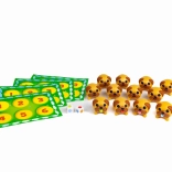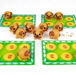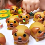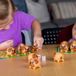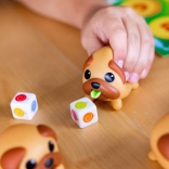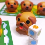Kostki z kolorowymi lizakami wskazują, które mopsiki należy znaleźć, co dodaje grze dynamiki i strategii.