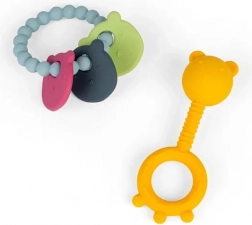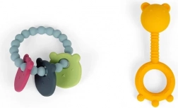 Zestaw wykonany jest z bezpiecznego silikonu spożywczego, który jest trwały i lekki, idealny dla małych rączek dziecka. Zabawki posiadają teksturyzowane powierzchnie, które dostarczają bodźców sensorycznych i pomagają rozwijać chwyt oraz zręczność. Dodatkowo, delikatny dźwięk grzechotki wzmacnia te bodźce.