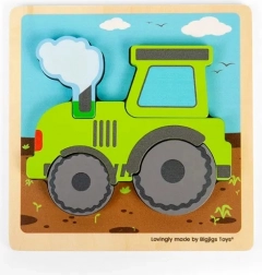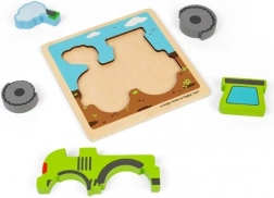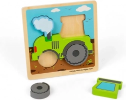 Odkryj urok drewnianej układanki wtykowej z motywem traktora, idealnie dopasowanej do małych dziecięcych rączek. Składa się z pięciu solidnych elementów, które są kolorowe i łatwe do chwytania. Dzięki prawidłowemu umieszczaniu elementów dzieci czerpią radość z gotowego zielonego traktora. Układanka nie tylko bawi, ale także wspiera: