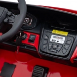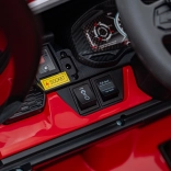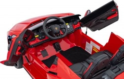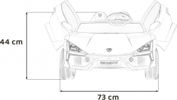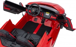 Wnętrze zachwyca podwójnym siedzeniem z eko skóry z pasami bezpieczeństwa, realistyczną kierownicą, pedałami i czytelnym panelem sterowania. Dzieci pokochają wyposażenie audio – radio FM, MP3, USB, AUX i Bluetooth, w tym wgrane melodie oraz klakson. Otwierane nożycowe drzwi i w pełni funkcjonalne oświetlenie LED podkreślają premiumowy wygląd.