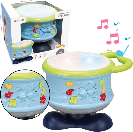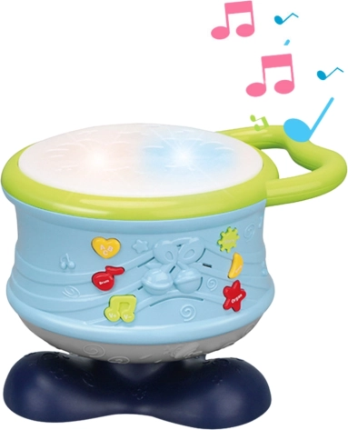 - Interaktywny bębenek z podświetleniem LED; ruch obrotowy z przechylaniem na boki; wesołe melodie i efekty dźwiękowe; ergonomiczny uchwyt do przenoszenia