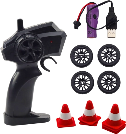 W zestawie znajdziesz komplet kół do driftu, dzięki którym osiągniesz dłuższe i bardziej kontrolowane poślizgi.