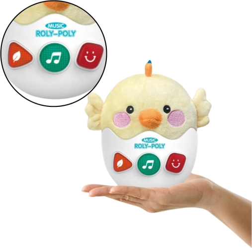 Interaktywne kurczątko wyposażono w intuicyjne przyciski aktywujące różne dźwięki, w tym kołysanki, kojące odgłosy natury oraz wesołe melodie. Efekty świetlne wzbogacają doznania sensoryczne dziecka i pomagają w rozwoju pierwszych bodźców wzrokowych i słuchowych. Funkcja kołysania i radosne dźwięki wywołują dziecięcy śmiech i motywują do dalszej zabawy.