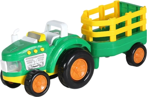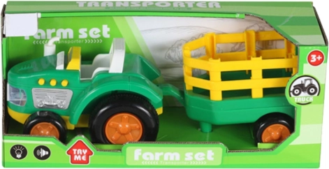 Ten zestaw farmerski zawiera zielony traktor z żółtą przyczepą oraz figurki farmera i zwierząt. Traktor ma realistyczny wygląd z efektami świetlnymi i dźwiękowymi, które zachwycą każdego małego fana pojazdów. Światła świecą, a dźwięki aktywują się za pomocą przycisków z boku traktora.