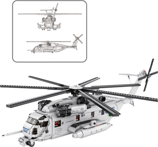 Model bazuje na potężnej, wielozadaniowej maszynie CH-53 i wiernie oddaje jej charakterystyczną sylwetkę z głównym i ogonowym wirnikiem. Budowa z 2192 elementów rozwija zręczność manualną, cierpliwość i logiczne myślenie, a po ukończeniu zapewnia imponującą ekspozycję do każdej kolekcji.