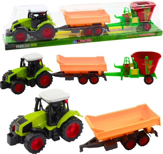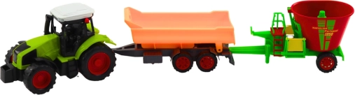 - Zielony traktor, pomarańczowa przyczepa (wywrotka), czerwono‑zielony wóz paszowy