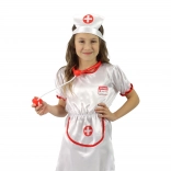 Uroczy dziecięcy kostium pielęgniarki dla małych medyczek. Idealny na karnawał, bale przebierańców i tematyczne przyjęcia. Zestaw zawiera sukienkę i czapkę. Rozmiar S dla dzieci w wieku 4–6 lat (ok. 105–116 cm). Stetoskop nie jest częścią zestawu.