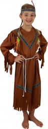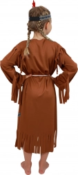 Kostium dla dziewczynki został zaprojektowany z myślą o komforcie i efekcie: brązową sukienkę zdobią kontrastowe lamówki i bogate frędzle, które pięknie falują przy każdym kroku. Przyjemny materiał tekstylny oraz luźniejszy krój zapewniają swobodę ruchów, dzięki czemu Twoje dziecko będzie bawić się bez ograniczeń. Dopasowana opaska z piórkiem dopełnia całość, a sznurek służy jako prosty pasek.