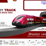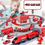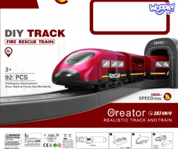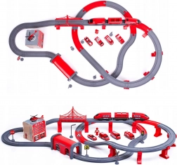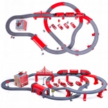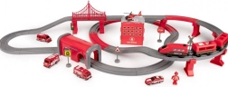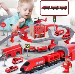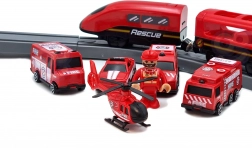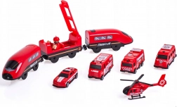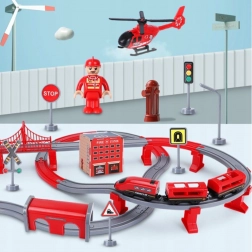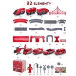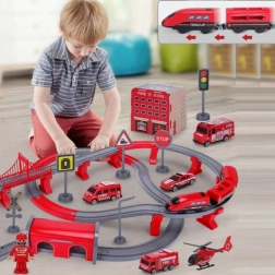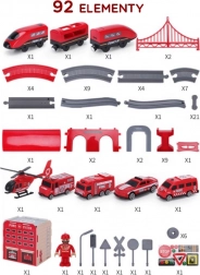 W zestawie znajduje się lokomotywa (2× AAA, brak w zestawie), 2 wagony, 4 pojazdy strażackie, helikopter, figurka strażaka, lokomotywownia, most, tunel, tory, podpory i znaki drogowe. Połączenie kolei i drogowego sprzętu ratowniczego wspiera koordynację ręka–oko, orientację przestrzenną i zabawę fabularną.