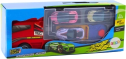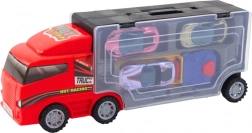 Duży tir i trzy sportowe autka w kolorowej odsłonie – idealny prezent dla dzieci od 3 lat.