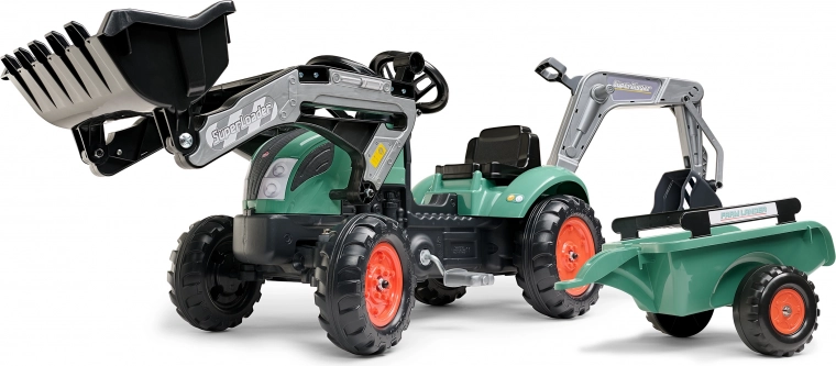 Traktor na pedały FALK z przednim ładowaczem i przyczepą to świetny wybór dla małych farmerów w wieku 2–5 lat. Oferuje solidne wykonanie, funkcjonalną ruchomą łyżkę, klakson w kierownicy oraz bezpieczną i stabilną konstrukcję. Wykonany z wysokiej jakości plastiku, w tym częściowo z materiałów z recyklingu – idealny prezent do aktywnej zabawy na świeżym powietrzu.