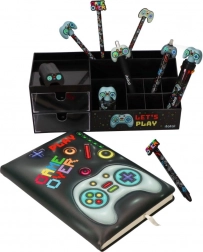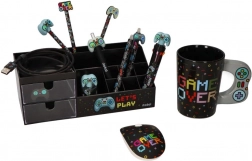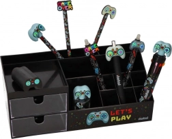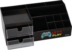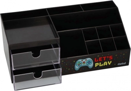Utrzymuj swoje biurko perfekcyjnie uporządkowane dzięki temu stylowemu organizerowi w czarnym kolorze z motywem LET’S PLAY. Łączy w sobie dwie przezroczyste szufladki oraz wiele przegródek na długopisy, kable, drobne akcesoria lub gamingowe gadżety. Wytrzymałe, plastikowe wykonanie i zabawny gamingowy design doskonale pasują do gabinetu, pokoju ucznia i kącika gracza.