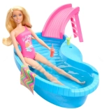 • Lalka Barbie ma wszystko, czego potrzeba na idealne letnie popołudnie: basen, zjeżdżalnię i akcesoria.