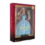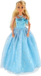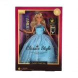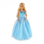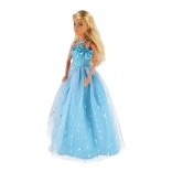 Lalka ma długą niebieską suknię z delikatnym wzorem i połyskującymi detalami, które zachwycają od pierwszego spojrzenia.