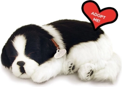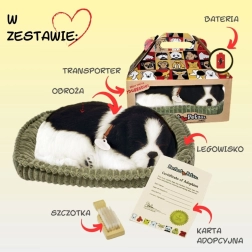 Ten wiernie odwzorowany pluszowy piesek wygląda i sprawia wrażenie jak prawdziwe szczenię. Delikatna czarno‑biała sierść, obroża z blaszką oraz spokojny sen z efektem oddychania tworzą kojącą atmosferę do odpoczynku i zasypiania. Idealny dla dzieci marzących o własnym pupilu.