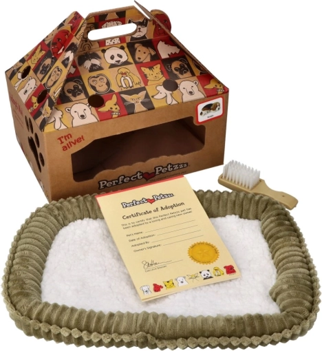 W zestawie znajduje się miękkie legowisko, w którym kotka odpoczywa. Wystarczy wyjąć ją z pudełka i od razu cieszyć się przyjemnym towarzystwem.