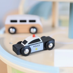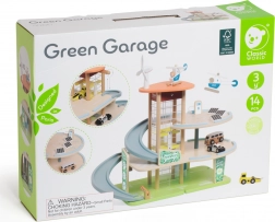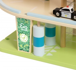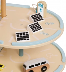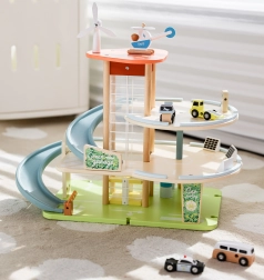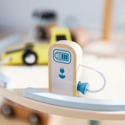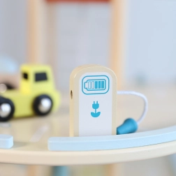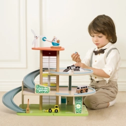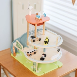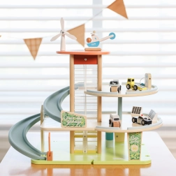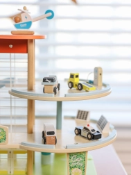 Ten drewniany, trzystopniowy parking umożliwia dzięki ręcznie sterowanej windzie przemieszczanie zabawek między piętrami. Specjalna kręta rampa pozwala na szybki zjazd aut. Dodatkowo wyposażono go w elektryczną stację ładowania. Zestaw obejmuje trzy autka i helikopter, które zapewnią godziny zabawy i rozwiną dziecięcą wyobraźnię.
