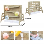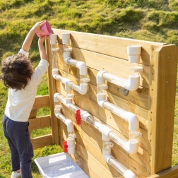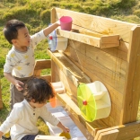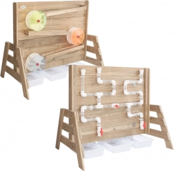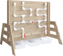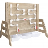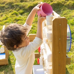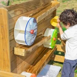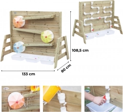Drewniana konstrukcja z impregnowanego drewna jest odporna na warunki pogodowe i pokryta nietoksyczną powłoką. Świetnie uzupełni piaskownicę i zewnętrzny plac zabaw – zapewnia nieskończoną zabawę oraz bezpieczne środowisko do eksperymentów z przepływem wody i wprowadzaniem kół w ruch.