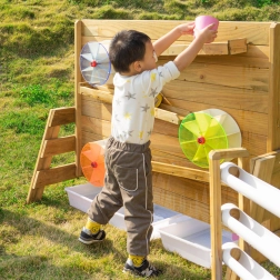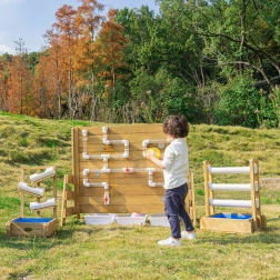 Ta dwustronna ściana łączy sensoryczną zabawę wodą z nauką STEM. Jedna strona oferuje kolorowe koła wodne i rynny do obserwowania przepływu wody oraz zależności przyczynowo-skutkowych, druga strona przynosi sieć przezroczystych i białych rurek z zaworami do sterowania przepływem. Dzieci ćwiczą małą motorykę, myślenie logiczne i współpracę.
