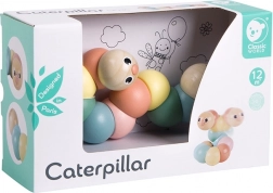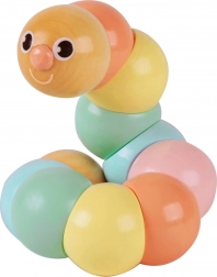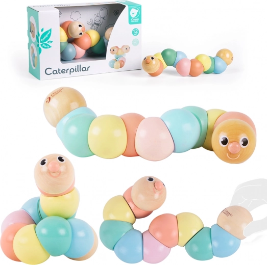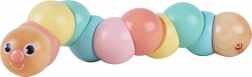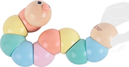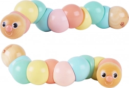 Drewniana gąsienica to idealna pierwsza zabawka motoryczna: wygodnie leży w dłoni dziecka, gładko się zgina i obraca oraz zachęca do odkrywania kształtów i ruchu. Pastelowe kolory stymulują percepcję wzrokową, a przyjazna buźka gąsienicy zaprasza do zabawy raz po raz.