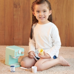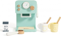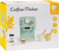 Zestaw zawiera wszystko, czego dzieci potrzebują do serwowania „kawy”: ekspres, 2 kubeczki, 2 łyżeczki, „mleko” oraz tamper/miarkę do kawy. Zabawa wspiera motorykę małą, koordynację oko–ręka oraz interakcje społeczne.