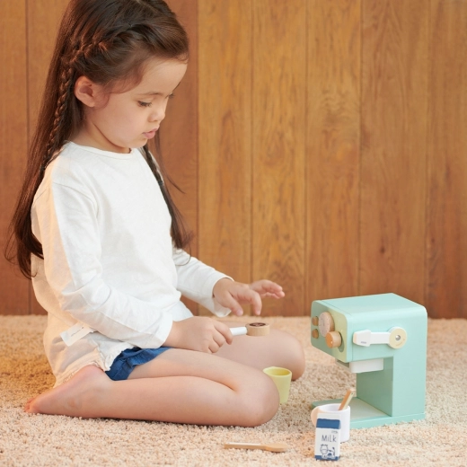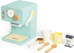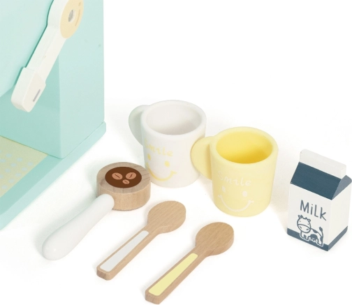 Podaruj małym baristom autentyczne wrażenia z przygotowywania kawy. Ten drewniany ekspres w turkusowym wzornictwie wygląda realistycznie dzięki dźwigniowemu sterowaniu oraz obrotowemu pokrętłu z mechanicznym dźwiękiem. Staranne wykonanie bez ostrych krawędzi i wysokiej jakości naturalne drewno gwarantują trwałość i bezpieczeństwo.