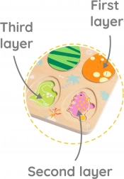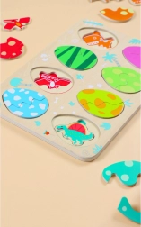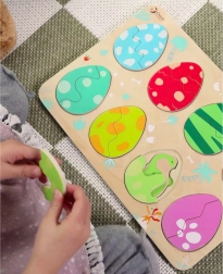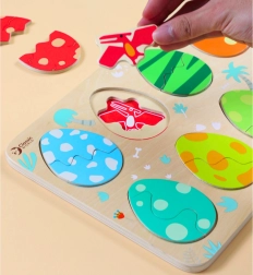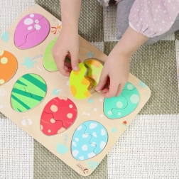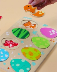 Ta wysokiej jakości drewniana układanka łączy zabawę z nauką. Dzięki trzem warstwom dzieci mogą stopniowo odkrywać jajka dinozaurów, znajdować pod nimi urocze dinozaury, a na najniższej warstwie wyszukiwać ilustracje–podpowiedzi. Żywe kolory i bezpiecznie wykończone elementy zachęcają do zabawy wciąż na nowo.