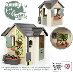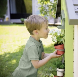 Otwierane okiennice, drzwi oraz detale, takie jak kratka na doniczki, wspierają wyobraźniową zabawę i pielęgnację roślin w naturalnym otoczeniu.