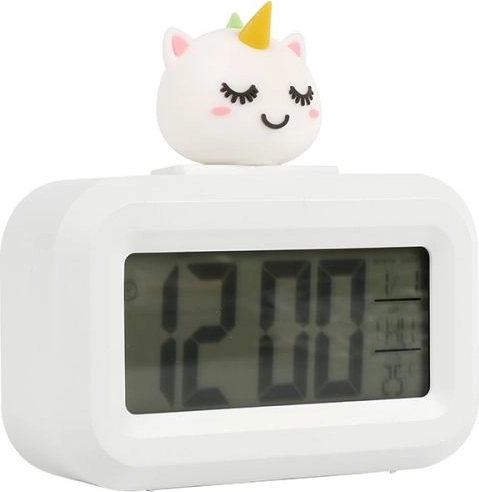 Uroczy biały budzik z motywem jednorożca ucieszy dzieci i miłośników magicznych dodatków. Dzięki kompaktowym wymiarom sprawdzi się na stoliku nocnym lub biurku. Zasilanie zapewniają 2 baterie AAA (nie są częścią zestawu). Łatwa obsługa, lekka konstrukcja i bezpieczny design są idealne dla dzieci od 3 lat.