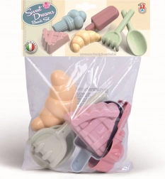 - Zawartość zestawu: grabki, łopatka i 4 foremki (lód na patyku, lody, babeczka, croissant)