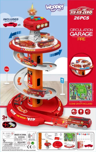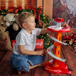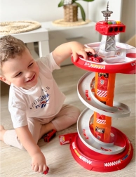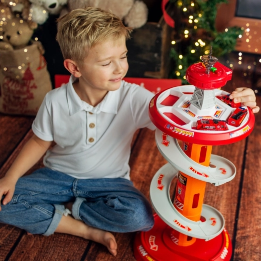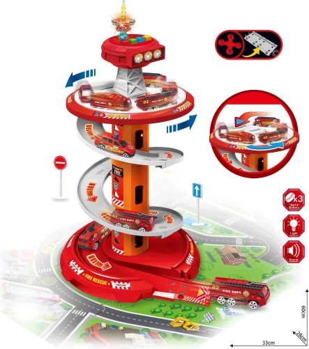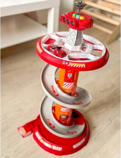 Zabawny spiralny parking dla małych strażaków marki WOOPIE oferuje wielopoziomowy tor z szybkim zjazdem, efektami świetlnymi i dźwiękowymi oraz 3 strażackimi autkami. Dzieci od 3 lat będą się świetnie bawić, pędząc po okrężnej rampie, odgrywając akcje ratunkowe i jeżdżąc po dołączonej macie drogowej ze znakami.
