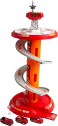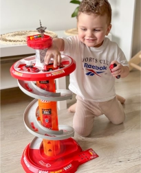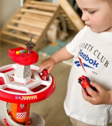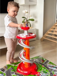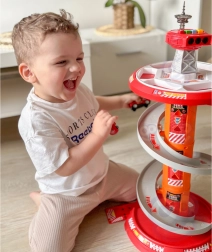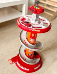 Rozkręć zabawę z wielopoziomowym strażackim parkingiem WOOPIE! Stabilna wieża ze spiralną rampą umożliwia płynny i szybki zjazd autek z góry aż do bazy. Dzieci rozwiną motorykę małą i wyobraźnię, ruszając do akcji po oznaczonej trasie wyjazdowej i zgodnie ze znakami drogowymi.