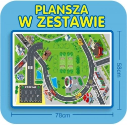 W zestawie znajdziesz 3 strażackie autka, znaki drogowe oraz matę drogową z wyznaczoną trasą wyjazdową.