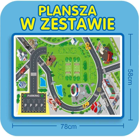 - Kompletny zestaw z 26 elementami, w tym autkami i znakami drogowymi.