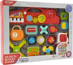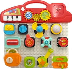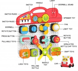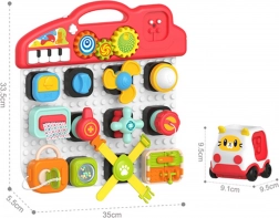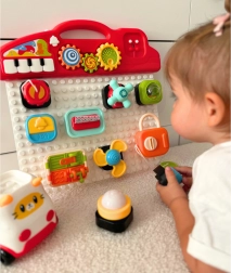 Panel składa się z różnorodnych interaktywnych elementów, które można dowolnie podłączać i odłączać, podobnie jak klocki. W skład zestawu wchodzi również autko w kształcie kostki, do którego można dołączać elementy z tablicy. Na dołączanych kostkach znajdują się różne typy przełączników, gałek, przycisków, wyjmowanych chusteczek, zamek z kluczem i otwierane okienka. Te elementy rozwijają u dziecka umiejętności motoryczne, poznawcze i sensoryczne, a także ćwiczą koordynację ręka-oko.