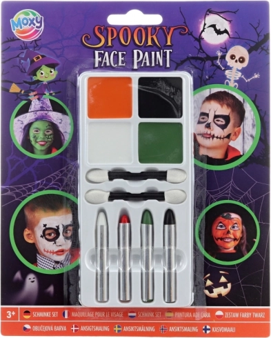Zestaw MOXY do malowania twarzy na straszny Halloween: 4 kolory, 4 kredki, 2 aplikatory. Łatwa aplikacja i demakijaż. Idealny na karnawał i imprezy.